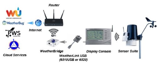 - Feature : Perfect for low consumption requirements, remote monitoring applications, or weather station owners that do not want to leave their pc on 24/7 / Wi-Fi allows you the freedom to move your display console anywhere in your home or office while still reporting to the internet / Simply plug the Weather Bridge data logger into the vantagepro2 console or data logger, and connect to your router via Ethernet cable or Wi-Fi / The Weather Bridge converts your weather station into an internet ready device and streams weather data real time to weatherunderground.com / Includes Davis instruments vantagepro2 weather station