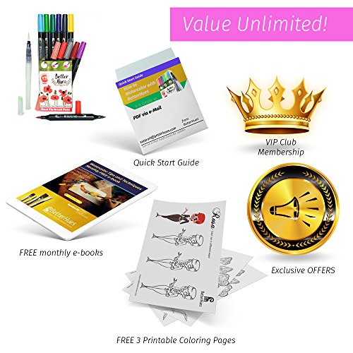 The MAXIMUM VALUE: Get the Brush Pen Combo along with FREE PRINTABLE COLORING PAGES, e-BOOKS, ELITE MEMBERSHIP and COMPLETE SUPPORT! And Enjoy the EXCLUSIVE offers specially created for VIP members!