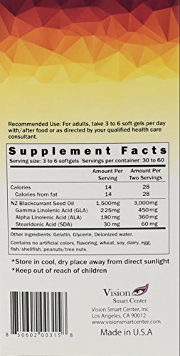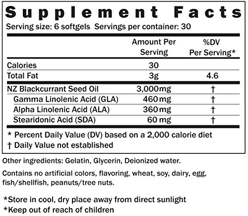 Blackcurrant Seed Oil:3000mg, GLA:450 mg, ALA: 360 mg, SDA:60 mg