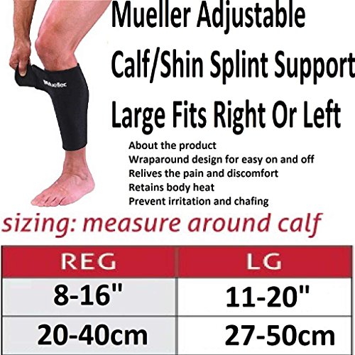 Studio : Mueller Publisher : Mueller Binding : Health and Beauty Product Description Mueller adjustable calf / shin splint support lightweight support provides firm, comfortable compression to help relieve pain and discomfort associated with shin splints. The soft neoprene blend retains body heat, stimulating circulation while controlling excess fluid in the calf area. Adjustable straps help provide controlled compression and custom fit. Fully-trimmed edges with smooth seams help prevent irritation and chafing. Wraparound design provides easy on and off. 0