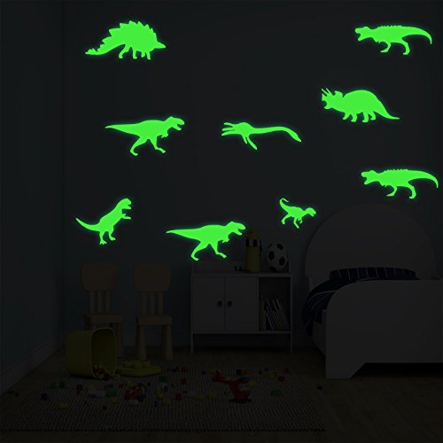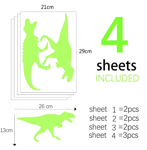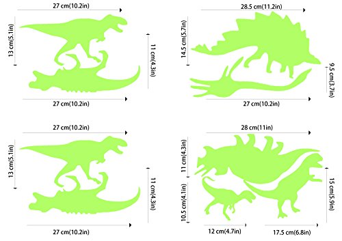 - The size of the dinosaurs set we provide is the biggest on Amazon, with high quality glossy luminous material, the glow will last 4 hours after turning off the lights. Fluorescent wall stickers, during the day and at night there are two different colors. In the morning it's light green clean look, the stickers merge with the wall,and in the dark the dinosaurs are very shiny. Please let stickers absorbs sunlight or LED lights enough time, so the glow effect will be the same as our picture shows.