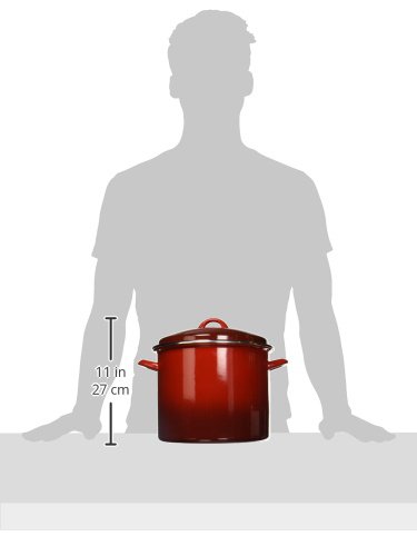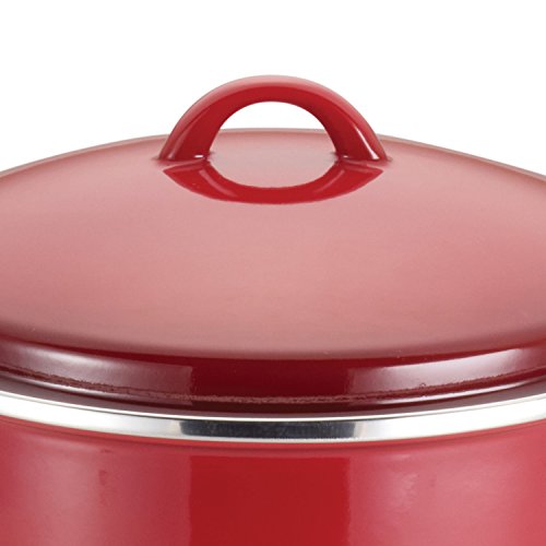 Boil two pounds of penne or make a double batch of the family's favorite soup or stew with the Rachael Ray Enamel on Steel 12-Quart Covered Stockpot. Designed for durability, this large pot features carbon steel construction for even heating and a beautiful stainless steel rim to finish and help protect the pot's edge. The vibrant, sturdy porcelain enamel exterior is stain resistant, easy to clean and adds a pop of welcome color to the kitchen. Generous loop handles make it easier to move the pot between kitchen stations, even when full of Rachael's Mexican Chorizo and Turkey Chili. A coordinating lid snugly seals in heat and moisture and features a rubberized knob for a comfy grip. Oven safe to 400 DegreeF, this stockpot coordinates well with many other pieces in Rachael's cookware and bakeware collections. Prepare delicious, fuss-free family meals with the durable and colorful Rachael Ray Enamel on Steel 12-Quart Covered Stockpot.Feature
