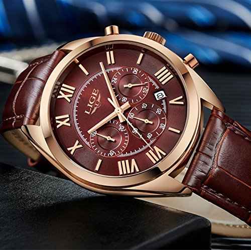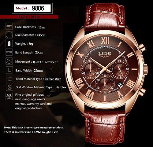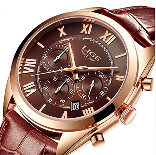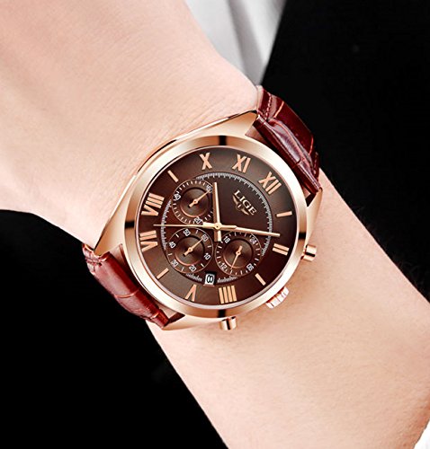 LUXURIOUS DESIGN :Noble deep brown genuine leather strap and rose gold stainless steel watch case,succinct Roman numerical time display,a perfect watch for business.