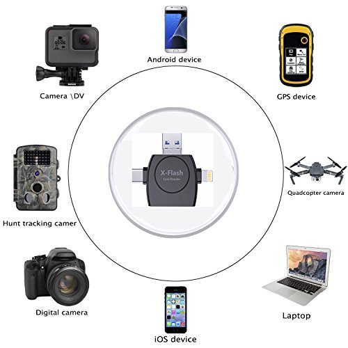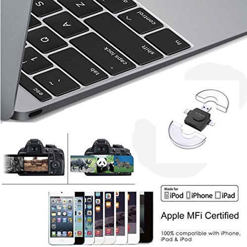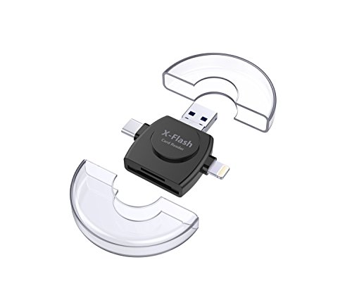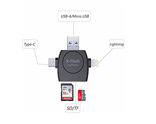 4 Adapter in 1 Card Reader: Lightning adapter for iOS devices; USB C adapter for Type C devices;Micro USB adapter for Android devices; USB adapter for PC/Macs.