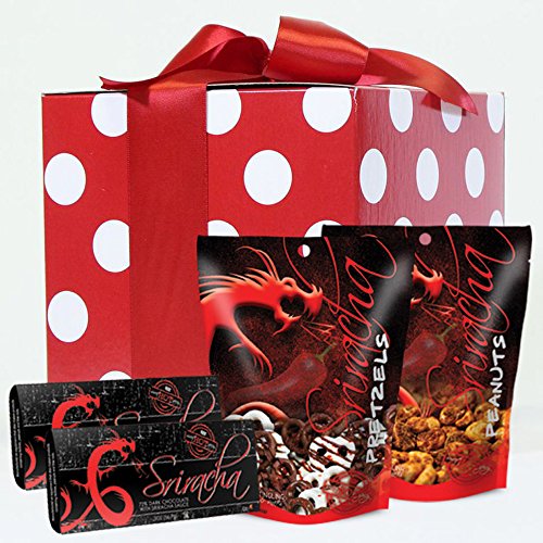 -. Feature : FLAVOR EXPLOSION: This sampler gift is bursting with flavor! Rich dark chocolate blended with the snazzy spice of Sriracha sauce makes for an addictive flavor you'll be sure to love! / GIFT GIVING MADE EASY: Our Sriracha infused gift box is a fun, tasty and unique gift for any chocolate lover, Sriracha lover, party host or for kids and adults alike! / ONLY THE BEST: Hand-made gourmet chocolate and small-batch-roasted premium peanuts included for your snacking pleasure / VARIETY FOR ALL: Includes two Sriracha chocolate bars and one bag each of Sriracha chocolate-covered pretzels and Sriracha peanuts / HANDMADE TO PERFECTION: At Sugar Plum, we have a blast pushing the boundaries of typical holiday treats and coming up with terrifically tasty treats that are made to perfection, every time.