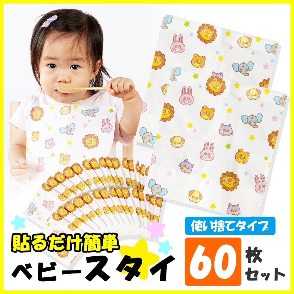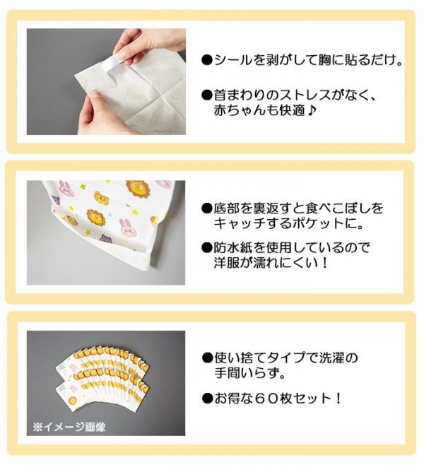 使い方はシールを剥がして胸に貼るだけ。首回りの締め付けがなく、赤ちゃんも快適です!使い捨てタイプで、お母さんもラクラク♪動物柄で赤ちゃんが楽しめる!お得な60枚セット! |