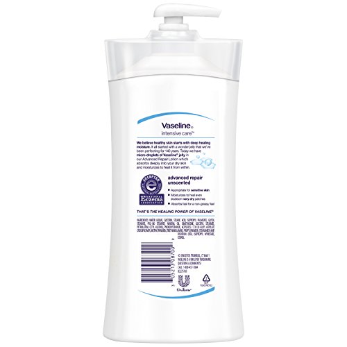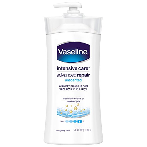 -. Feature : Prescription strength moisturization & its unscented formula makes it a suitable lotion for dry, itchy skin / Vaseline Intensive Care Advanced Repair Unscented Lotion provides fast-healing moisture for dry, itchy skin / Micro-droplets of Vaseline Jelly lock in moisture to relieve even stubborn dry skin / Absorbs fast for a non-greasy feel / Awarded the National Eczema Seal of Acceptance