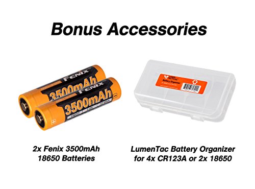 - PACKAGE CONTENTS - Fenix TK35UE 2018 Flashlight, Spare O-Ring, Lanyard, Holster, USB Charging Cable, User Manual, 2x 3500mAh 18650 Rechargeable Batteries, Lumen Tactical Battery Organizer