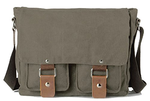 -. Feature : Military style messenger canvas bag for tablet PC, power bank, cellphone, wallet, book, pens, B5-size files, a small umbrella, etc. / Flap cover and zip closure, 2 front pocket and 1 back side zipper pocket. / Dimension:(L)10.63" x (H)9.06" x (W)3.94" [Weight]1.29 pounds. / Material: Durable cotton canvas and cow leather / Color: Green, Black, Dark Brown