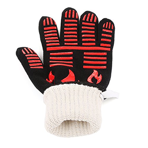 - BBQ grilling cooking gloves could withstand extreme temperatures up to 932ºF. Protect your hands from getting scalded. The surface of gloves have silicon Stripe.Inside is made up of 55% cotton and 45% polyester , that's comfortable.