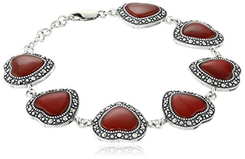-. Title : Sterling Silver Red Agate and Marcasite Heart Link Bracelet, 7" + 1" Extender