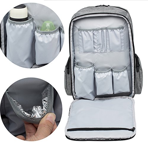 - Total 19 Functional Pockets: 2 Easy-Access Side Pockets; 2 Front Hidden Zipper Pockets; 1 front main compartment includes 2 insulated Milk bottle pockets and 6 Little Pockets; 1 Top Zipper Pocket for changes; 1 main compartment with 4 pockets for baby's clothes, shoes, etc.