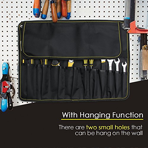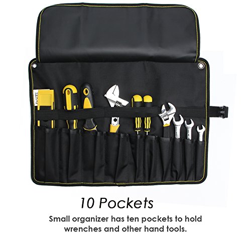 Small organizer has ten pockets to hold wrenches and other hand tools. With roll-up and hanging function