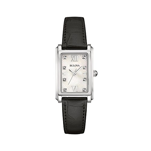 From the Bulova Diamonds Collection. In stainless steel with 8 diamonds individually hand-set on a white mother-of-pearl dial, curved mineral crystal, second hand, black leather strap, and water resistance to 30 meters. Dimensions: 21.0 x 32.5mm Thickness: 7.8mmFeature