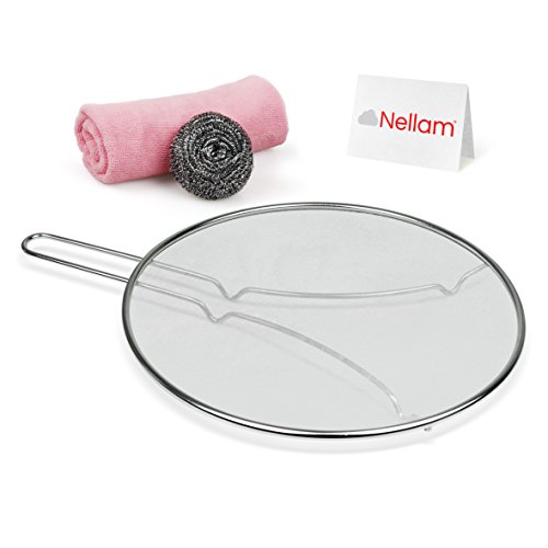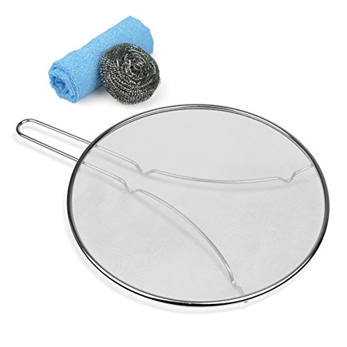 Splatter Screen Guard Stainless Steel for Cooking and Frying with Grease Oils - Heavy Duty with Resting Feet - Includes Microfiber Towel and Scouring Pad (Cleaning Kit) - 100% Rust Free … (13 inch)