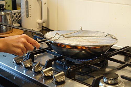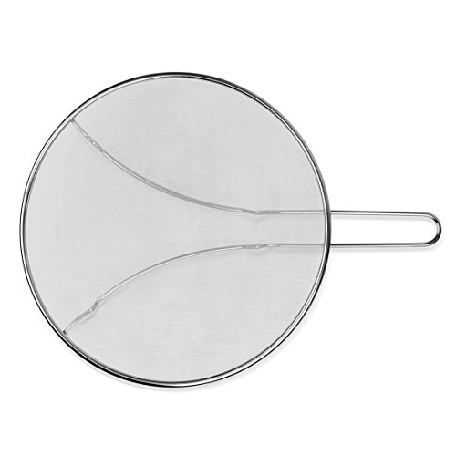 High quality 13” stainless steel splatter screen for cooking with oils on the frying pan, bubbling sauces, and liquid splatter. Features a durable mesh screen and resting feet. 100% Rust-Free.