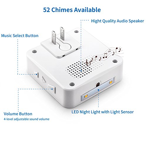 - [52 Chimes] 52 different tunes with auto memory function and 4-level volumes for you choose from. Yellow light on receiver works as an indicator at night.
