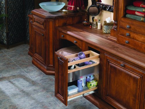 - Adjustable shelves and bins perfect for curling irons and hair dryers