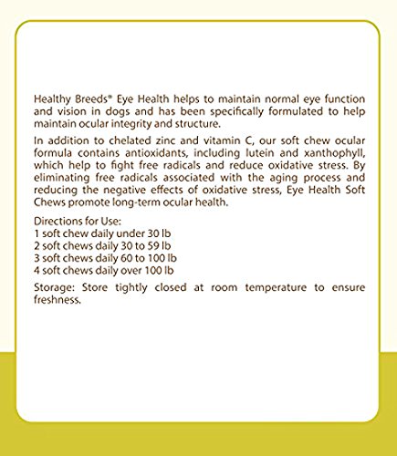 Healthy Breeds Eye Health helps to maintain normal eye function and vision in dogs and has been specifically formulated to help maintain ocular integrity and structure. In addition to chelated zinc and vitamin C, our soft chew ocular formula contains antioxidants, including lutein and xanthophyll, which help to fight free radicals and reduce oxidative stress. By eliminating free radicals associated with the aging process and reducing the negative effects of oxidative stress, Eye Health Soft Chews promote long-term ocular health.Feature