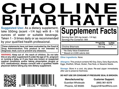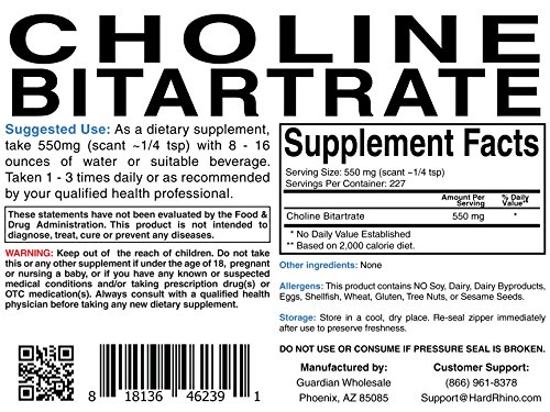 -. Binding : Health and Beauty -. Brand : Hard Rhino -. Feature : Choline Bitartrate / Manufactured and Packaged in the USA. / In-House Lab Tested for Identity and Purity. / High Quality Ingredients at Value P.R.Ices. / FDA Registered Facility. -. Label : Hard Rhino -. Manufacturer : Hard Rhino -. MPN : 33585 -. PackageQuantity : 1 -. PartNumber : 33585 -. ProductGroup : Health and Beauty -. ProductTypeName : HEALTH_PERSONAL_CARE -. Publisher : Hard Rhino -. Studio : Hard Rhino -. Title : Hard Rhino Choline Bitartrate Powder.