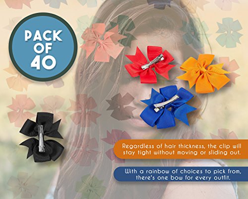 ASSORTED HAIR CLIP SET: The set includes 40 multi-colored hair bows attached to an alligator clip that will keep your little ones' hair secured. Regardless of hair thickness, the clip will stay tight without moving or sliding out.