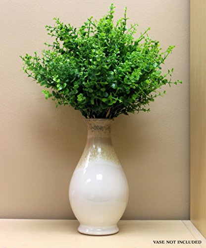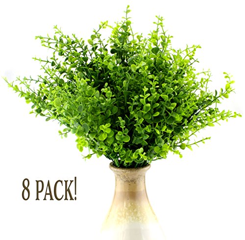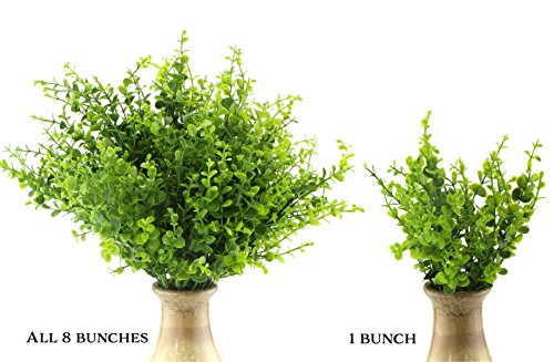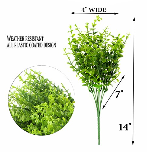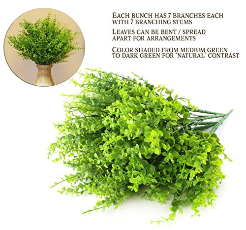 Faux Plastic Shrubs All around your home: Use at poolside Decorate your veranda or patio Use in garden borders Use in window boxes or planters Use in flower arrangements Use in a fairy garden or gnome garden Use for shrubbery when on your knightly quest, Monty Python costumes for Halloween? Use in your office Features: 8-bunch value pack: Each bunch has 7 branches each with 7 branching stems. Size: 14 inches overall length. Grass stalks are 7 inches long. Individual leaves ⅛" to ½" diameter. Each bunch can be spread to about a 7 inch span while still having fullness. Total weight 10 ounces Weather resistant all plastic coated design; great for indoor or outdoor Leaves can be bent / spread apart for arrangements Color shaded from medium green to dark green for "natural" contrast Great for places with "watering restrictions" or low lightFeature