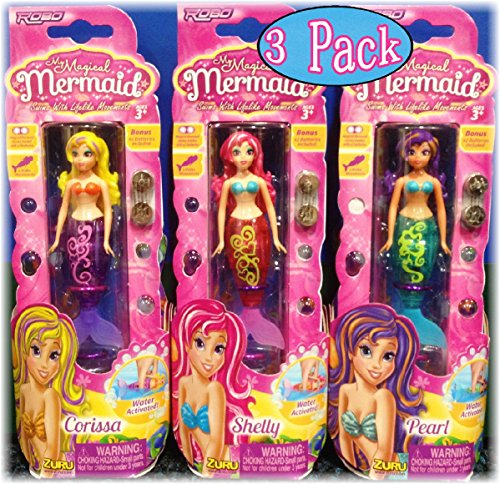 My Magical Mermaids are built with latest aquatic and micro-robotic technology, simply drop your Mermaids into water and watch them burst to life, they'll spiral and dance with beauty and grace! Set includes all three amazing Mermaids and begin the underwater adventure! Includes 3 My Magical Mermaid, 6 Pre-loaded button cell batteries and 6 additional bonus batteries. Ages 3 and up.Feature