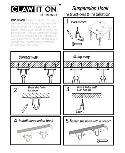 ? VERY IMPORTANT: Please consult with your Local Hardware Professionals?regarding if?these 4" (inch) Hex Screws included are suitable for use for your?planned?project. You may possibly need a different Hardware / Screws due to different projects used with these Suspension Hooks Anchors have?different mounting options. ? Suspension Ceiling Swing Hooks Anchors Heavy Duty Steel Strong Weld Melting Points / Safe Load 1,450 lb (657kg) with BOTH 2 Hook Pack CLAW IT ON for different Mounting Anchor Option Projects ? Instructions Installation Sheet included ? 2 PACK?Suspension Ceiling Swing Anchor Hooks with 8 Hex Screws?(4" inch) with Instructions Installation included ? Good for different Mounting Anchor Option Projects ? Made of Steel Swing Anchor Hooks, Suspension Swing Anchors, Hangers, Hand Rings,?ceiling hook Anchor, yoga hook ?Can be used indoors and outdoors SUITABLE FOR...... ?Swings ?Swing Hangers ?Swings Seat ?Yoga Hooks ?Gymnastics Rings ?Climbing Rope ?Baby Infant Toddler Buckets Swings ?Trapeze Rings Swings ?Pod ?Swing-Set Brackets Kit ?Porch Swing ?Hammock Cradle ?Chair Suspensions ?Ceiling Hook ?Strong Weld Melting Points ? Recyclable if available in your community. Material: Steel. Brand: TRENZEK / CLAW IT ON Color: Black ?SEE OUR OTHER BRACKETS ? Recyclable if available in your community ? Patent Pending 0 |