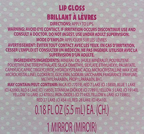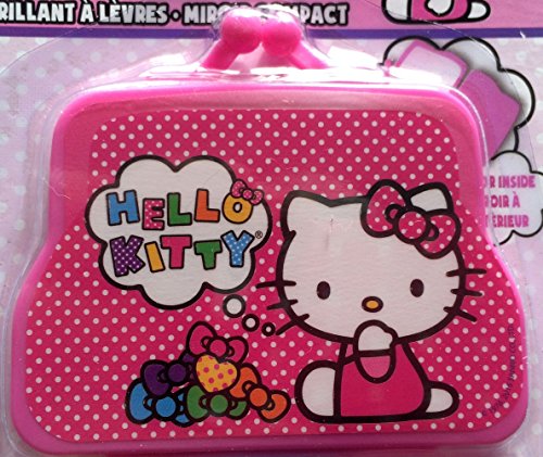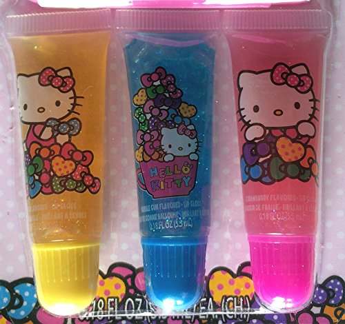 Hello Kitty Lip Gloss with Mirror Compact with 3 tubes of lip gloss in flavors Vanilla, Bubble Gum, and Strawberry. Each tube is 0.18 fluid ounce (5.5 ml). 3 x 2.75 inch compact with mirror. Great gift for your Hello Kitty fan.Feature