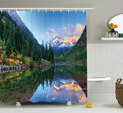 Ambesonne Lake House Decor Collection, Reflection of Snowcapped Maroon Bells in Fall, At Sunrise. Panoramic Picture Print, Polyester Fabric Bathroom Shower Curtain, 84 Inches Extra Long, Green Yellow