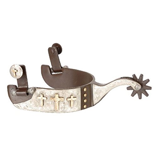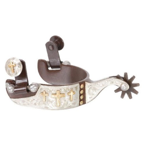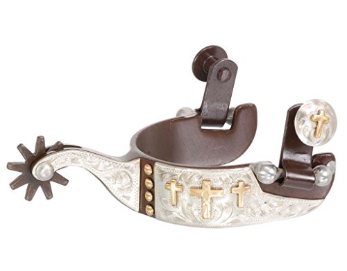 Product Description Antique brown finish with hand engraved German silver decorative overlay with gold triple cross and dot design. 10 point rowel. JTW5573927 JTS5470925 0
