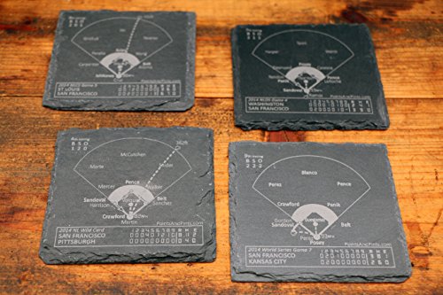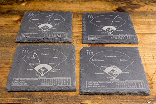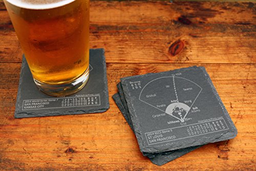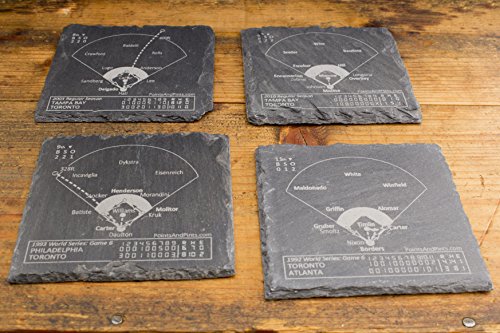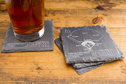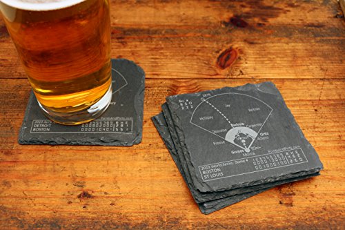 -. Feature : 100+ teams both college and professional: Basketball, Baseball, Football, Hockey, and Soccer / 4 Coasters: Set of four slate coasters with felt backing / Greatest Plays: Each coaster is laser-etched with a different great moment from the team's history / Historical Play Details: Coasters include player movements, date, score, and relevant play details / Perfect gift for a true fan! Rest your pint on history.