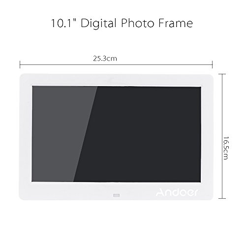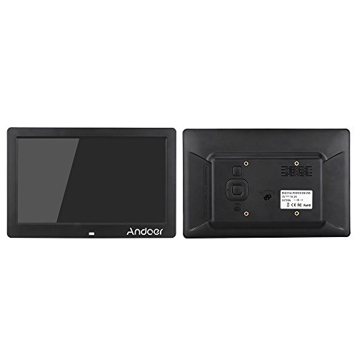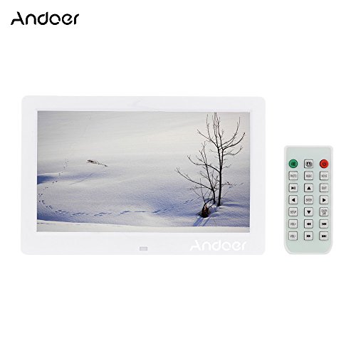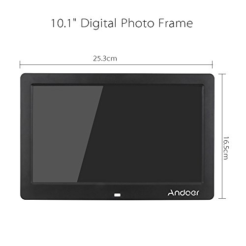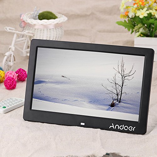 -. Brand : Andoer -. Feature : 10,1 Zoll digitalen Bilderrahmen mit hoher Auflösung von 800 * 600 LCD-Display. Zeigt Ihre Lieblingsfotos in der automatischen Diashow Modus.Reichen und lebendigen Farben zeigt Ihre Bilder mit bemerkenswerter Bildqualität. / Spielt Video und Musik mit eingebautem Lautsprecher und Kopfhörerausgangsbuchse. Die Uhr, Kalender, Wecker und Zeiteinstellung. / Stereo Lautsprecher gebaut, um Ihre Lieblingsmusik zu genießen. Ohne erforderliche Konfiguration und keine Software installiert. / Mit zwei USB-Verbindung: eine für das Lesen der U-Flash-Disk; einer zum Anschluss an den Computer. Sie können sogar eine SD-Karte von einer Kamera und spielen Sie Fotos von ihr direkt ohne weitere Verarbeitung. / Eingeschlossen einen Stand für Unterstützung auf Desktops. Eine kompakte Infrarot-Fernbedienung (Batterie nicht im Lieferumfang enthalten) für bequemen Zugriff auf die Wiedergabesteuerung. -. Label : Andoer -. Manufacturer : Andoer -. PackageQuantity : 1 -. ProductGroup : CE -. ProductTypeName : CONSUMER_ELECTRONICS -. Publisher : Andoer -. Studio : Andoer -. Title : Andoer® 10.1 "HD Wide Bildschirm Hohe Auflösung Digitaler Bilderrahmen Verwenden Als Wecker MP3 MP4-Player mit Fernbedienung Gute Wahl zum Weihnachtsgeschenk