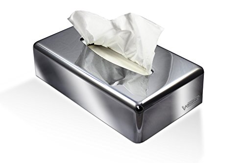 Chrome finish tissue box with plastic base to keep tissues dry.