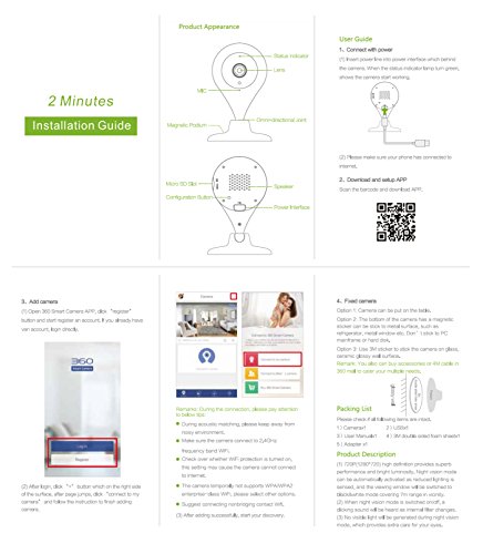 -. Feature : SUPER USER FRIENDLY | Simple setup within minutes. Versatile functions at your fingertips. / No cable clutter, no computer needed. One smartphone + WiFi in camera location is all you need. Download free app to add camera within minutes / Unlimited cameras installation / Unlimited family members or friends to share watching simultaneously. / Support Micro SD & cloud storage / Recording, playback, picture capture, night vision, facial recognition, motion detection - all at your fingertips. / INTELLIGENT HELPER | 360 D503/603 Camera can be installed in different places to help you to Comfort Baby / Care Elderly / Monitor Staff / Control Business / Secure Property / Watch Entrance or Exit / Build Up Social Platform / METICULOUS DESIGN | Care you Care / Two-way audio communication to soothe your baby with your gentle voice, express your concern to parents or give advice to your staff. Switch off the speaker to avoid disturbance to your sleeping baby - all depends on you. / IR LED (invisible light) provides a bright and clear image even in complete darkness / Wide angle of view 110 diagonally with omni-directional joint & magnetic base provide you with the perfect view. / SECURITY MOTION DETECTION | Look after the safety of your property / Instant snapshot or short video alerts sent to your smartphone when motion is detected. | FAMILY HAPPY MEMORY | Automatically Create Smile Album and Timeline Album / Facial Recognition Function collect every smiling face or expression & make them as a valuable photo album. / Automatically take photo every 30 minutes and mix all as a 5-second Timeline Album to record your happy day. / LIVE CHANNEL | Establish your own social share platform / 360 provide you with own live channel to share your profession, hobby, experience, tips, skill or opinion, etc./ Everyone can search the channel or be invited to view your live channel. Since then, you have your fans, follower and many "LIKES" as support. / If you would like to be an audience, you could search and follow your ideal channel from thousands of 360 existing live channels.