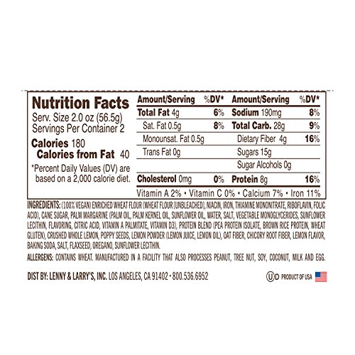 -. Feature : Zesty lemon poppy seed cookie containing no animal products, 16g protein, 8g fiber, kosher, vegan, no trans fat, non-GMO. / Fresh baked flavor with no dairy,no eggs, no soy, no high fructose corn syrup, no cholesterol, no preservatives, no artificial sweeteners, uses only sunstainable palm oil / Box of 12 4-ounce individually wrapped cookies / Ship directly from Lenny & Larry's warehouse / FREE SHIPPING on order over $55.00