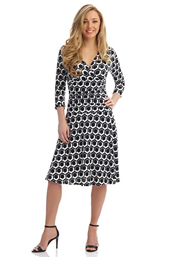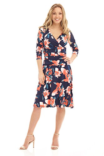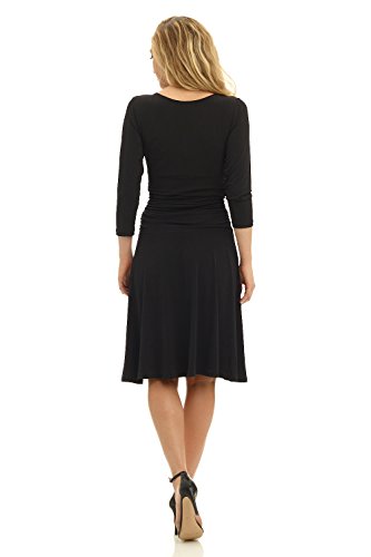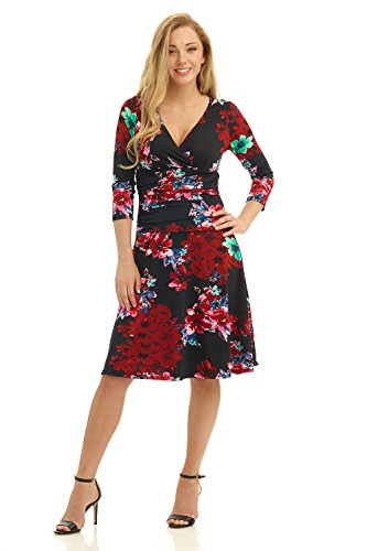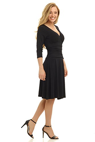 FLATTERING: Surplice crossover neckline elongates your look while still being modest. Wide ruched waist and flared skirt enhance and give an hourglass figure. Knee length skirt is classic and chic.