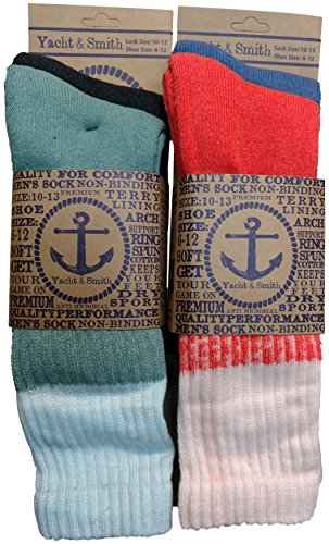 -. Binding : Apparel -. Brand : Yacht & Smith -. Department : mens -. Feature : CONSTRUCTED FOR COMFORT: This sock is constructed solely for your comfort. The ringspun cotton blend offers a superior softness when compared to typical crew socks. Designed to be a premium sock for multipurpose use. Made with premium fibers including 75% ring spun cotton, 20% polyester, and 9% spandex. / REINFORCED FOR COMFORT & DURABILITY: Features a reinforced heel for added comfort and durability. A non binding top makes the sock less constricting allowing you to wear it for lengthy wear. That also means no marks on your legs from socks that are too tight. These socks also offer arch support for your feet. / TERRY LINED CREW SOCKS: These terry lined socks makes these socks ideal for wearing under harsher weather conditioners. Ideal for the winter time by keeping your feet warm and cozy. Or you can wear these in all other seasons if you're looking to hike, go camping, fishing, hunting, and more. / ANTI-MICROBIAL & MOISTURE WICKING: These anti-microbial socks fight off bacteria and fends off odors, making these the perfect pair for the great outdoors and across a wide range of activities including sports. Wicks away moisture by drawing sweat away to keep your feet cool and dry. Size 10-13 will fit men's shoe sizes 6-12. / SATISFACTION GUARANTEED: Buy with confidence and get a 30-DAY MONEY BACK GUARANTEE. If you are not satisfied with our socks, please contact us and we will respond within 24 hours. Your satisfaction is our top P.R.Iority. -. ProductGroup : Apparel -. ProductTypeName : SOCKSHOSIERY -. Size : 10-13 -. Title : Mens Anti-Microbial Crew Socks, Comfort Knit Ringspun Cotton, Terry Lined, Premium Soft