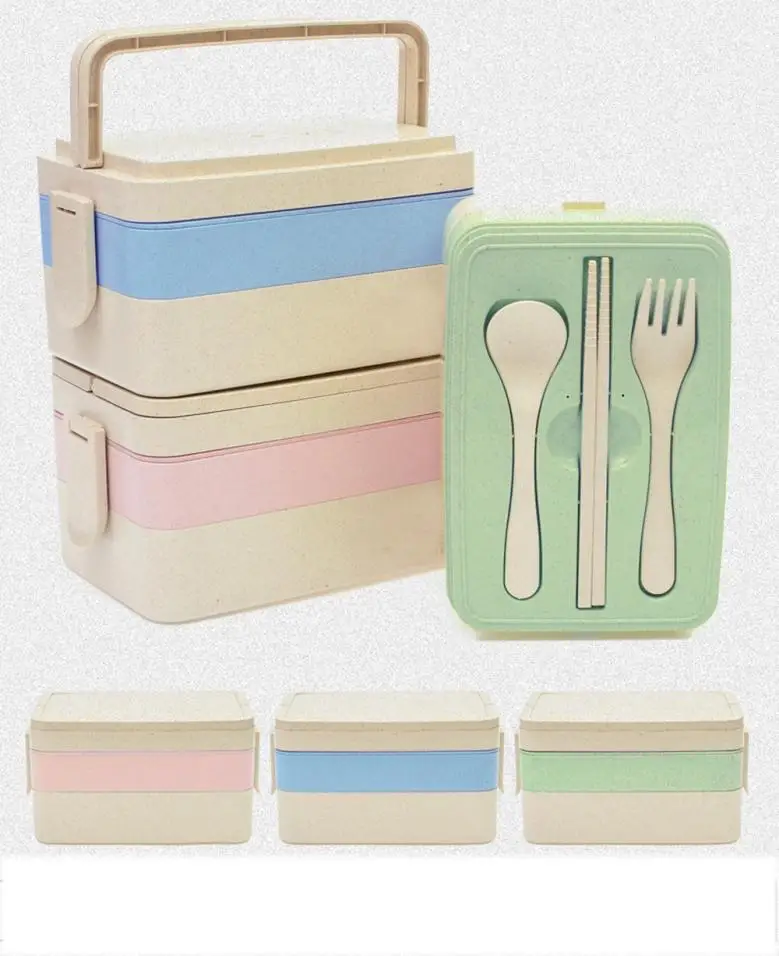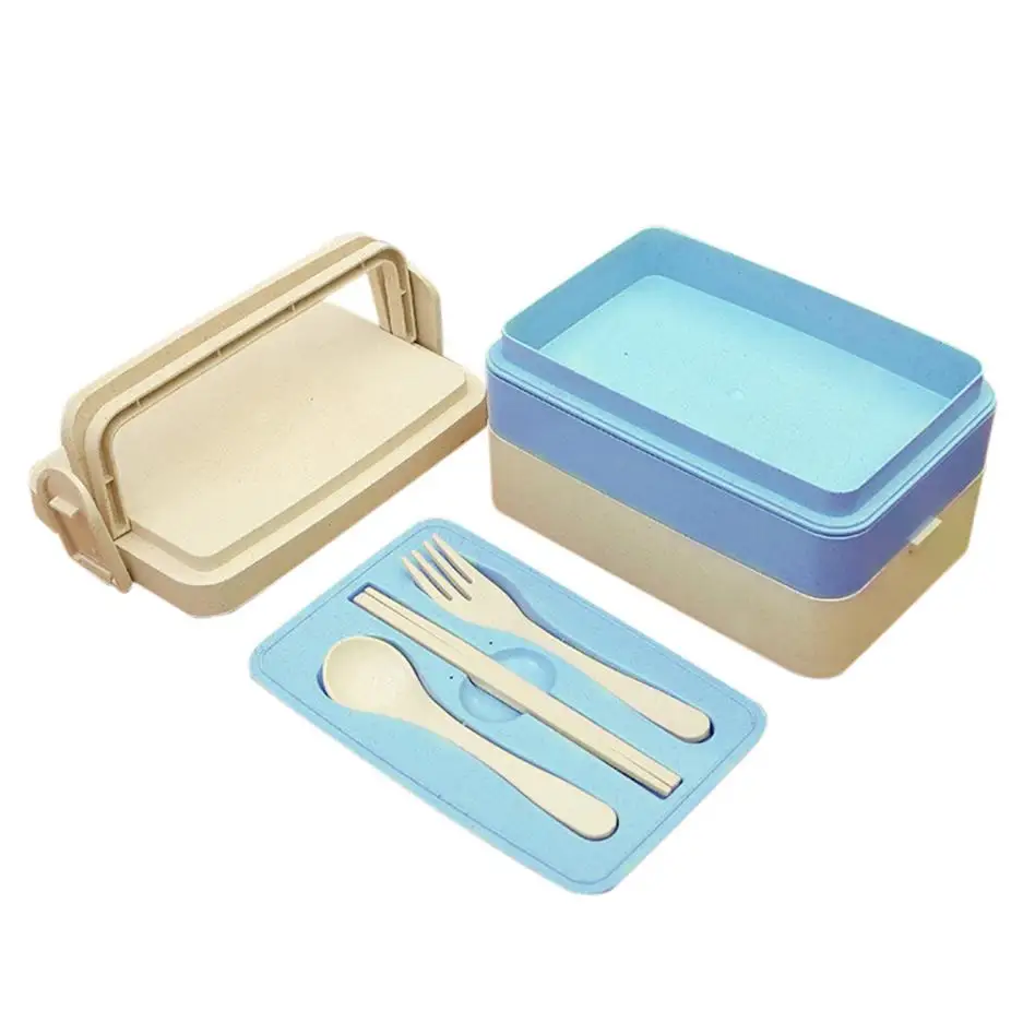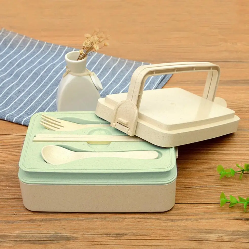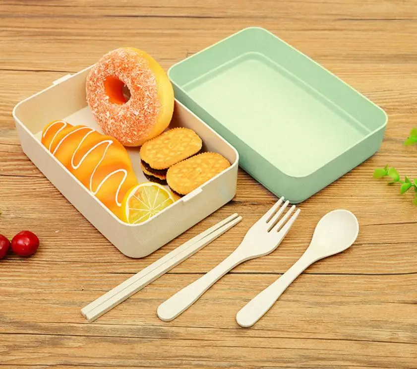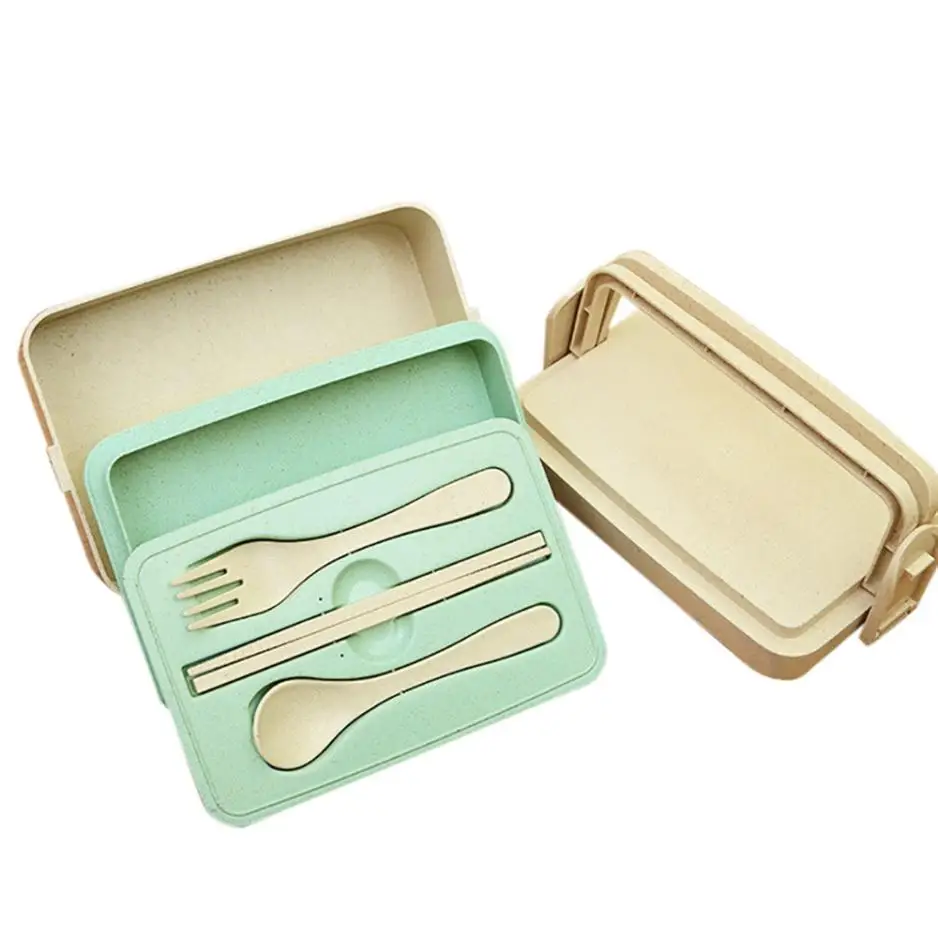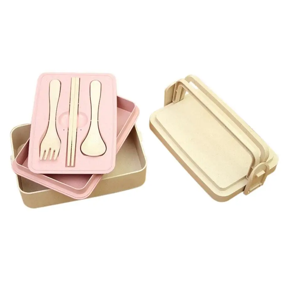 Lunch Box Food Container Portable Wheat Straw Bento Chopstick Fork Spoon Tableware Outdoor Camping Carrier