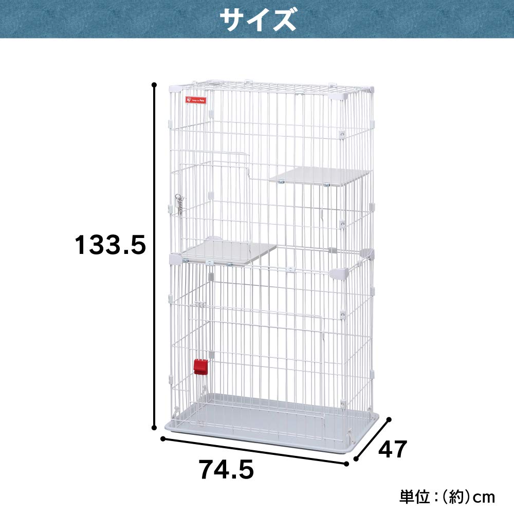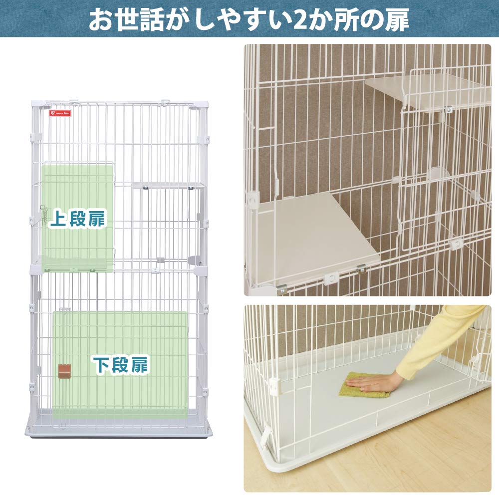 【商品説明】:愛猫の飼育に適した、高さのある2段タイプのケージです。 お部屋にスッキリ置けるスリムタイプです。 大きな扉でお掃除や物の出し入れがラクに行えます。 猫がゆっくりくつろげる大きめの丈夫な木製棚板が2枚付いています。 転倒防止チェーン付きです。