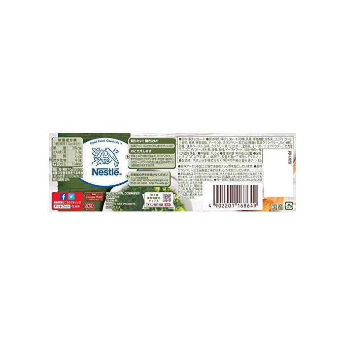 원재료:준쵸코렛(설탕,유당,식물성 기름지,전분유,코코아 버터)고, 소맥분,유당,식물성 기름지,아몬드,크랜베리 가공품(당절임 건조 크랜베리,포도당)고, 설탕,녹차 Paste,녹차,《라즈베리》과즙 파우더,전분유,이스트,코코아 파우더,카카오 마스,코코아 버터,유화 제,중탄산,향료,이스트 후드,(원재료의 일부에 대두를 포함한다)