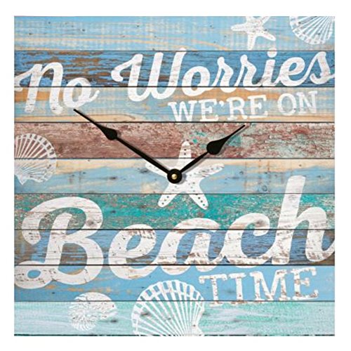 -. Title : No Worries We're on Beach Time Blue Seashell Distressed 14 x 14 Wood Wall Clock Sign