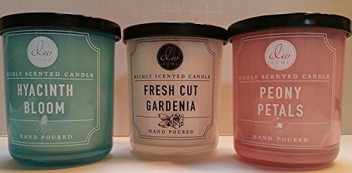 Variety Bundle of 3 DW Home Richly Scented Candles in Peony Petals,Fresh Cut Gardenia, and Hyacinth Bloom Scents. 4 oz each candle