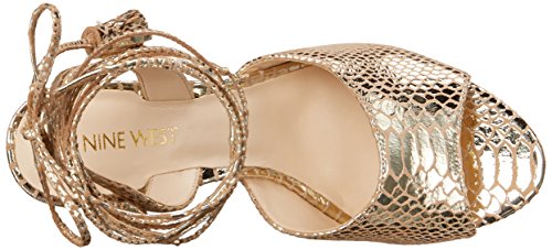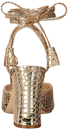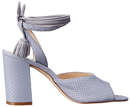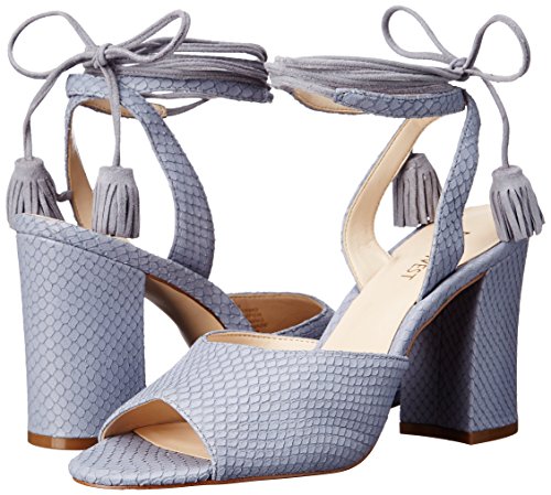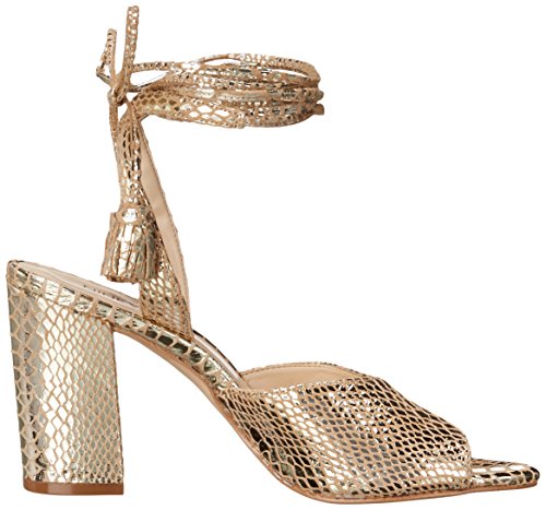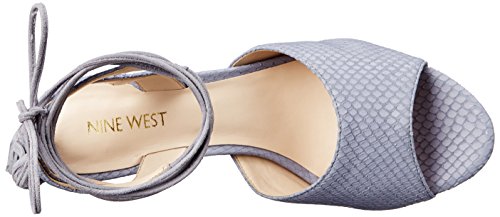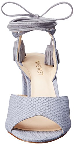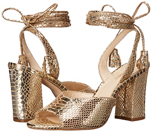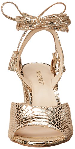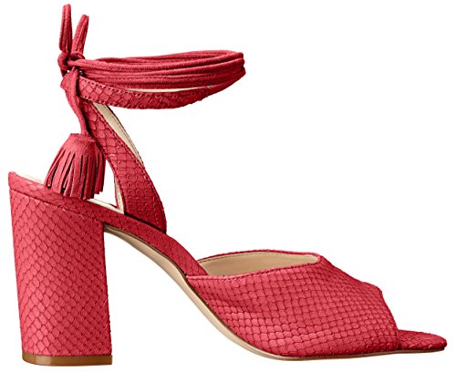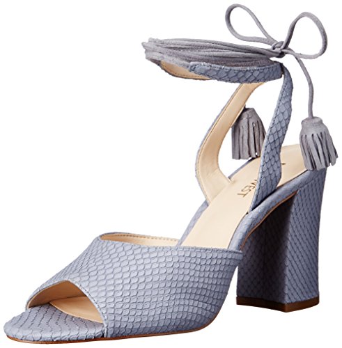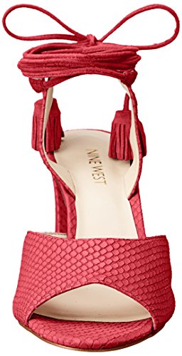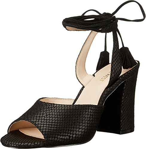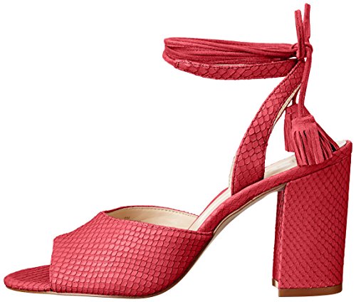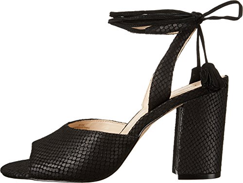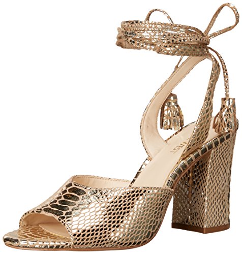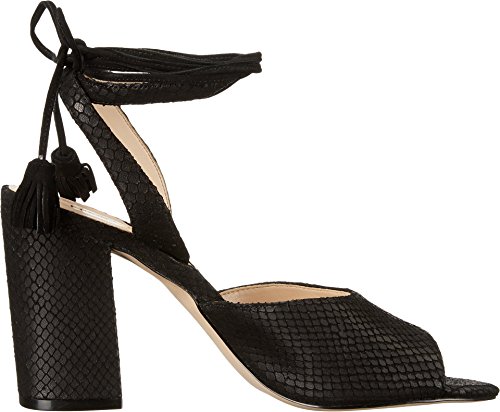 Dress sandal in solid-tone python texture featuring peep toe and slender ankle wrap with tassels