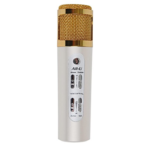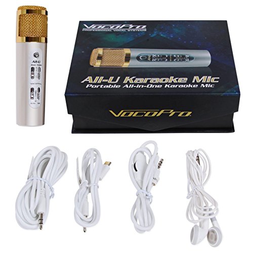 Love to sing? Or maybe you just want to practice new karaoke songs. VocoPro's All-U Karaoke Mic is an all-in-one personal karaoke machine. Just connect the All-U Karaoke Mic to a tablet or smartphone (Apple and Android compatible) and you'll be able to access tracks through the YouTube or karaoke apps on your device. Get the sound you want with the onboard Bass, Treble, and Echo controls built right into the mic body. You'll never wake the neighbors practicing tracks again thanks to the headphone output; both music and microphone signal are discretely routed to headphones or a sound system with an available 1/8" Stereo or RCA input. Track your performance improvement with specialized karaoke apps that are capable of creating your very own karaoke videos! Karaoke has never been this portable so pick up an All-U Karaoke Mic and take the party with you!