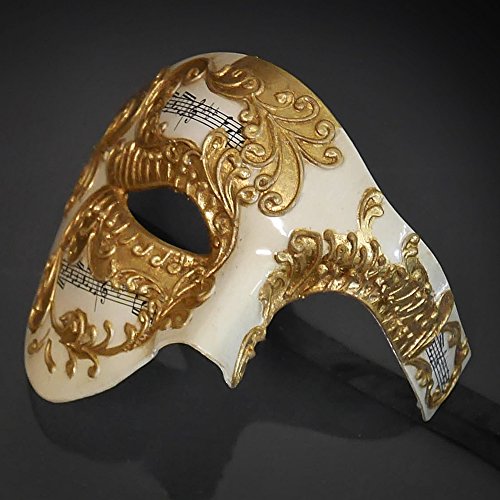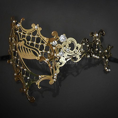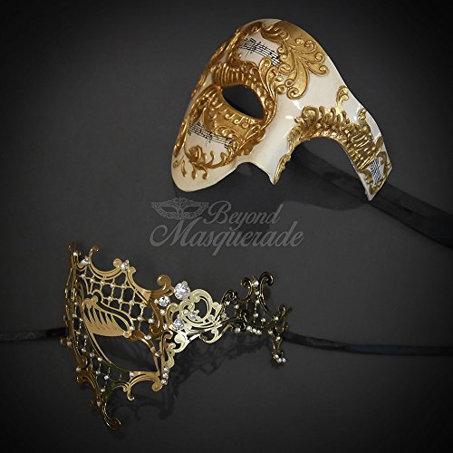 -. Binding : Misc. -. Brand : MasqueradeParty -. Color : Gold -. EAN : 0609015812624 -. Feature : Laser Cut Masquerade Mask / Size: One Size fit Most / Materials: Made of Paper Mache for His and Light Metal for Hers / Perfect for Masquerade, Mardi Gras, Wedding, Prom, and Costume Party! -. ProductGroup : Beauty -. ProductTypeName : BEAUTY -. Size : One Size -. Title : His and Her Gold Phantom of the Opera Themed Masquerade Mask -. UPC : 609015812624