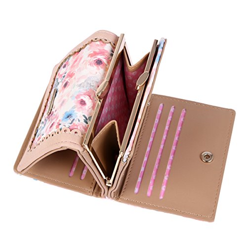 Inside, 8 card slots, 2 photo windows,1 bill site, 1 coin pocket with kiss lock.