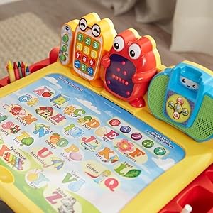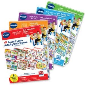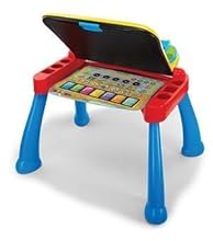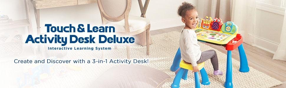 The Touch and Learn Activity Desk Deluxe is an interactive desk and includes five activity pages to explore that are filled with engaging contentExtend the fun with expansion packs (each sold separately) that include a wide curriculum; LED display illustrates letter and number stroke order and how to draw basic shapesTransforms from a desk into an easel and chalkboard with storage space for art supplies to encourage play and discovery; stool includedFor more ways to play, pretend to make a call on the toy telephone or listen to fun tunes on the music player; Progress Button reports on child's progressFeatures 100+ vocabulary words, 20+ activities and 20+ songs and melodies; requires 4 AA batteries (not included); intended for ages 2 years and upProduct DescriptionThe Touch and Learn Activity Desk Deluxe by VTech is a three-in-one desk with interactive activity cards that’s expandable for more fun and discovery! The desk features an interactive desktop and five pages to explore that are filled with engaging content including letters, numbers, music, colors and more. Choose from eight expansion packs (each sold separately) that each focus on a specific curriculum like nursery rhymes, reading skills, animals and numbers. It also transforms from a desk into an easel and chalkboard with plenty of storage space for art supplies to encourage play and discovery. The LED display illustrates letter and number stroke order and how to draw basic shapes. For even more fun, your toddler can play with the toy telephone or listen to fun tunes on the music player. Enjoy hours of fun as you create, discover and learn! Stool included. Requires 4 AA batteries (not included). Intended for ages 2 years and up.
