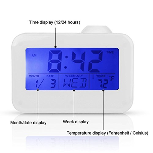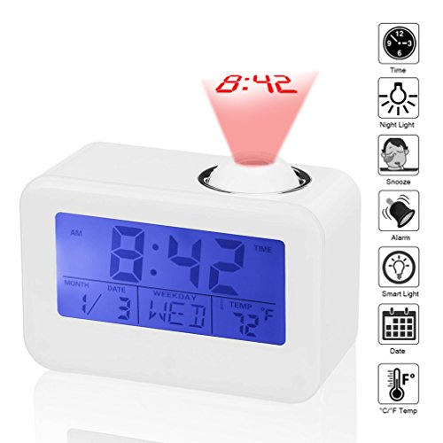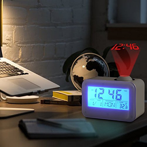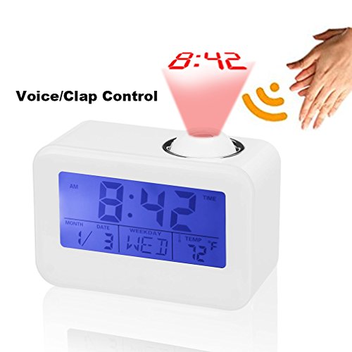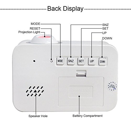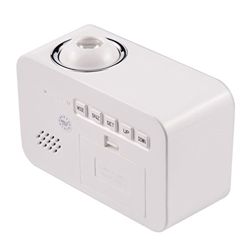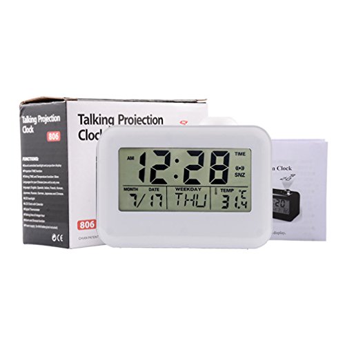 Dewanxin Digital Projection Alarm Clock This LED projection clock displays the current time and temperature and even speaks it aloud! It can also project the accurate time to your ceiling or wall. You could put it anywhere - study, bed room, desk. The clock is fully adjustable so you can customize it to your needs. Function: Time projection;Voice broadcast the time and temperature ;Luminous light;Calendar function ;Digital thermometer ;Alarm clock / snooze function ( 4 selections of music) ;Whole timekeeping function ;Voice control lighting. Features: LCD time temperature display with green backlight. Alarm with 10 minute snooze function. Voice talking function: report the current time in English. Four kinds of alarm sound selectable. Two time modes available: 12 hours/24 hours. Projects the accurate time, projecting angle has a 90 degree range. Specifications: Material: ABS plastic Power: 3 * AAA batteries or USB cable (not included) Package size: 13 * 9.7 * 6.2cm Weight: 0.51Ib/8.2Oz/235g Package Contents: 1 * LED Projector Alarm Clock 1x Instruction Note: 1. Please use the Carbon batteries instead of Mixed or Alkaline batteries. 2. Once the clock is not work, it may because of the inapplicable batteries, please change other new batteries. 0