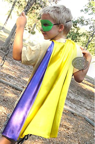 -. Feature : Purple Yellow Reversible satin superhero cape with matching yellow satin mask. / Dress like a superhero in seconds! / Machine wash, line dry. Velcro closure at neck / Fits kids ages 3-8; / Cape is 24" length, 33" wide at bottom